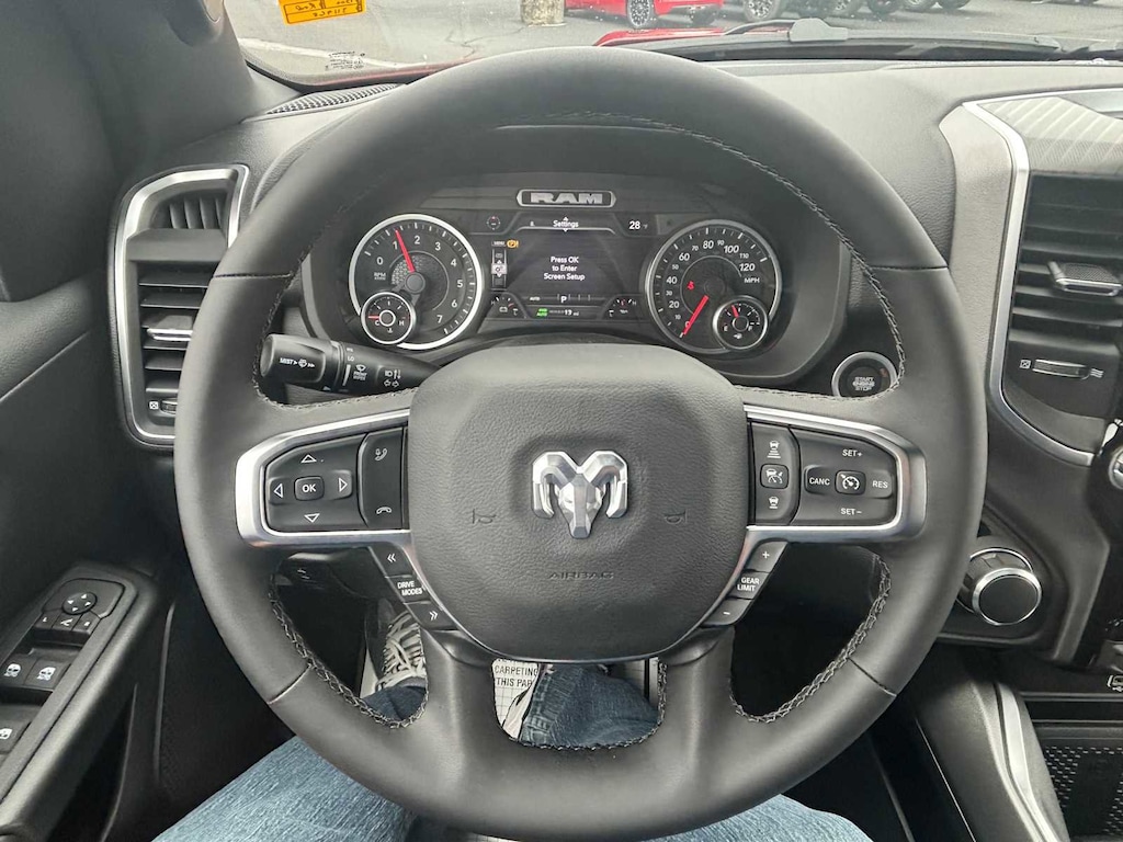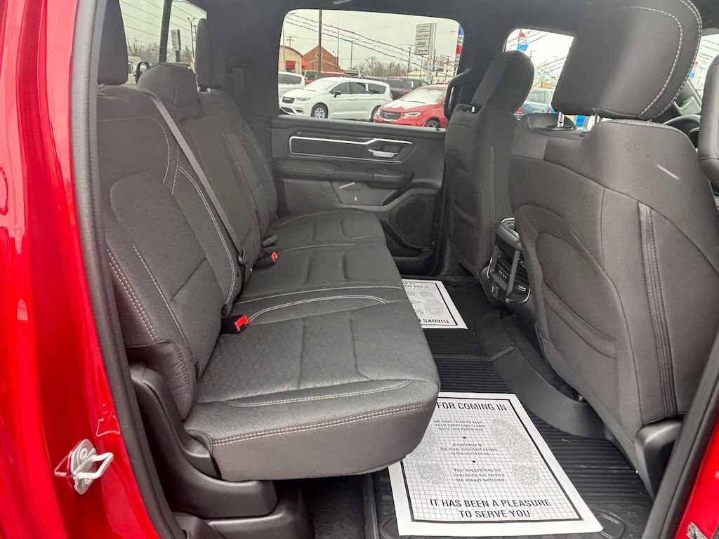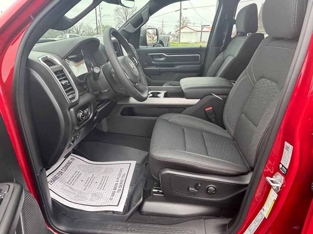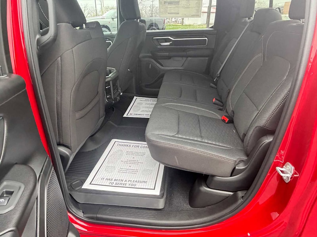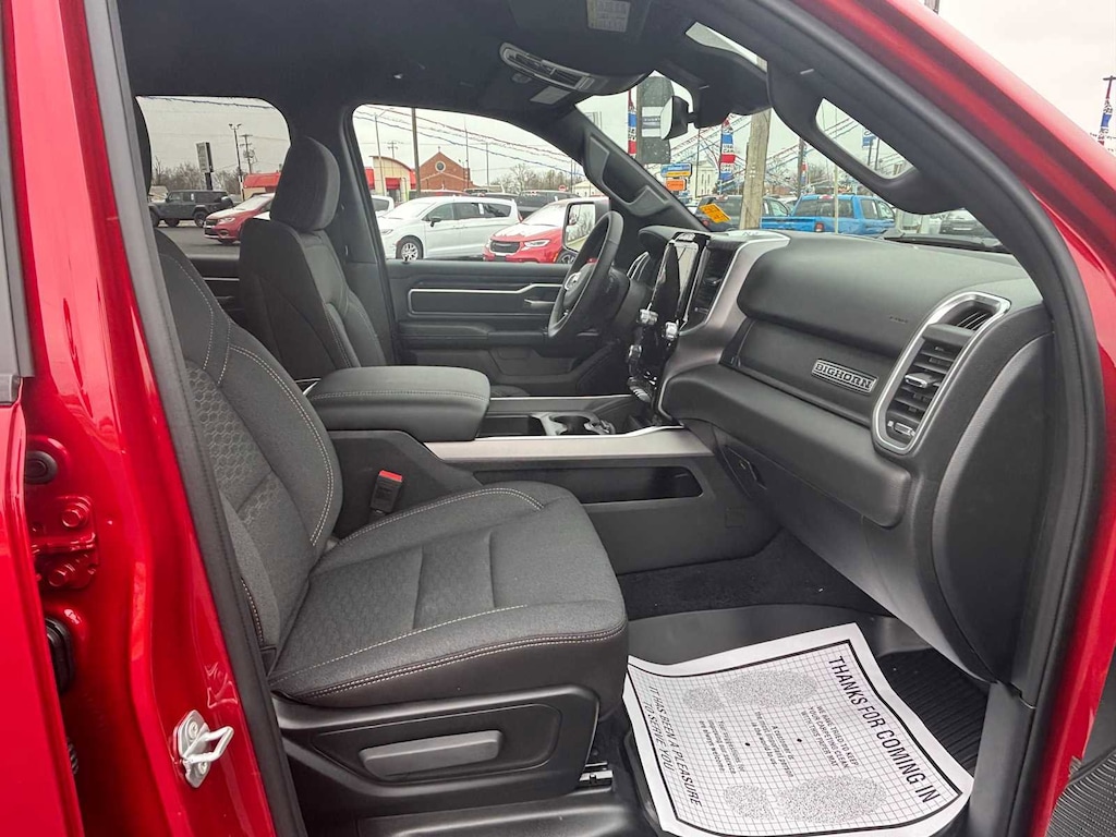 BIG HORN LEVEL 2 EQUIPMENT GROUP SiriusXM Radio Service, Power Adjustable Pedals, Leather Wrapped Steering Wheel, 12 Touchscreen Display, Glove Box Lamp, Auto Power-Folding Mirrors, 115V Auxiliary Rear Power Outlet, Media Hub w/2 Charge Only USBs, Heated Front Seats, Security Alarm, Black Premium Power Mirrors, Premium Overhead Console, 9 Amplified Speakers w/Subwoofer, Disassociated Touchscreen Display, Body Color Fender Flares, Remote Tailgate Release, 115V Auxiliary Power Outlet, LED Dome Lamp w/On/Off Switch, Universal Garage Door Opener, 2nd Row In Floor Storage Bins, Sun Visors w/Illuminated Vanity Mirrors, LED Footwell Lighting, Rear Window Defroster, Rear View Auto Dim Mirror, Rear Power Sliding Window, GPS Navigation, Overhead LED Lamps, Wheels: 20 x 9 Aluminum Chrome Clad, ENGINE: 5.7L V8 HEMI MDS VVT ETORQUE Active Noise Control System, Heavy Duty Engine Cooling, Passive Tuned Mass Damper, GVWR: 7,100 lbs, Dual Rear Exhaust w/Bright Tips, G/T Exhaust, 18 Aluminum Spare Wheel, NIGHT EDITION Tires: 275/55R20 OWL All Season, Bridgestone Brand Tires, Accent Color Premium Power Mirrors, Exterior Mirrors w/Supplemental Signals, Black Headlamp Bezels, Exterior Mirrors Courtesy Lamps, Grille Black Surround Black Mesh, Auto Power-Folding Mirrors, Wheels: 20 x 9.0 Aluminum Painted Clad, Auto Dim Exterior Driver Mirror, Black Exterior Truck Badging, Anti-Spin Differential Rear Axle, Accent Color Door Handles, Accent Color Tailgate Handle, Black Interior Accents, Dual Exhaust w/Black Tips, Body Color Front Bumper, Body Color Rear Bumper w/Step Pads, Black Tail Lamp Bezels, RAM Grille Badge - Black, Black Painted Exterior Mirrors Caps, MOPAR BLACK TUBULAR SIDE STEPS, MOPAR FRONT & REAR RUBBER FLOOR MATS, TRANSMISSION: 8-SPEED AUTOMATIC (8HP75). Ram Big Horn with Molten Red Pearlcoat exterior and Black interior features a 8 Cylinder Engine with 395 HP at 5600 RPM*. CLEAN AUTOCHECK!
